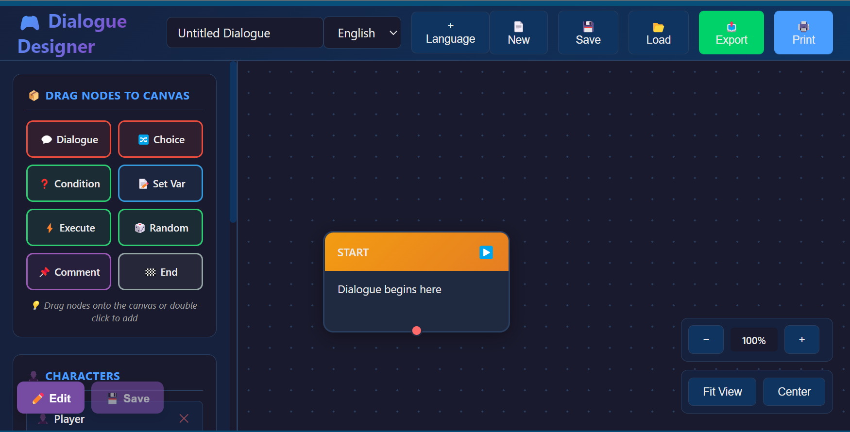 1. Click the "💬 Dialogue" button in the Node Palette